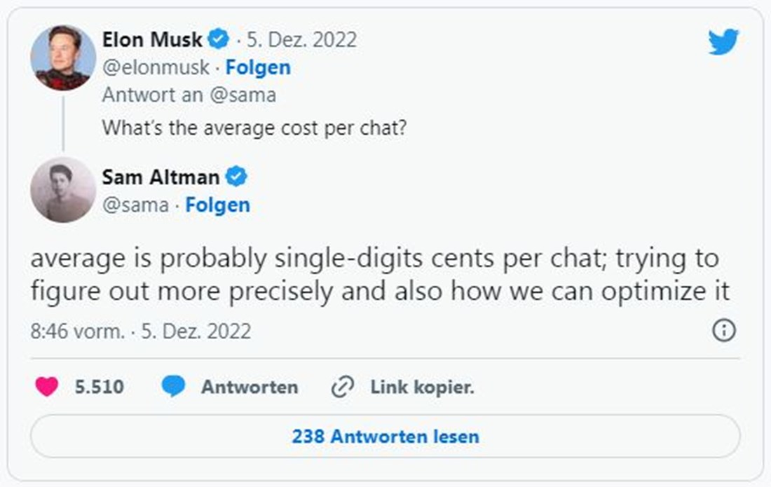 Tony: Bei anderen AIs hat OpenAI die Monetarisierung per Aufruf gestartet. Z.B. bei der Bildergenerierungs-AI Dall-E verlangen sie 2 Cent für Bilder mit der höchsten Auflösung. Ob dies auch mit ChatGPT gemacht wird, ist noch unklar. Typischerweise werden Conversational AIs in Dienstleistungen eingebettet, wie z. B. als Kernkomponente eines Chatbot eines Unternehmens. Auf Twitter diskutieren Sam Altmann (CEO von OpenAI) und Elon Musk (Investor von OpenAI) über Monetarisierung: