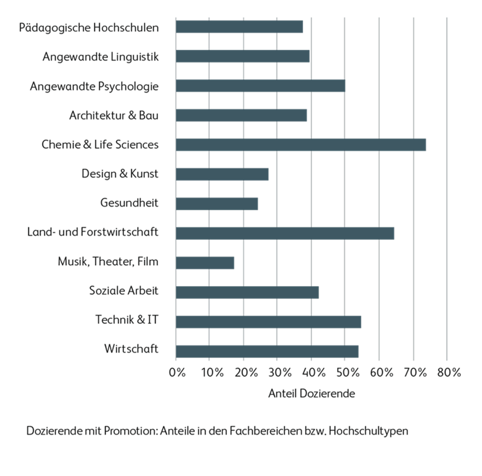 «Es wird immer wieder vermutet, dass Fachhochschulen und Pädagogische Hochschulen als Folge der Reformen des schweizerischen Hochschulsystems in den letzten Jahren dazu übergegangen sind, vor allem promovierte oder habilitierte Universitätsprofessorinnen und -professoren anzustellen. Die Studie widerlegt dies ebenso wie die behauptete Zunahme von Dozierenden ohne Praxisbezug», erläutern die Studienautorinnen. Der Anteil promovierter Dozierender ist in den verschiedenen Fachhochschul-Fachbereichen beziehungsweise den beiden Hochschultypen allerdings sehr unterschiedlich. Er schwankt zwischen 17 und 75 Prozent (vgl. Abbildung 2). Der Anteil Habilitierter liegt bei unter 5 Prozent.