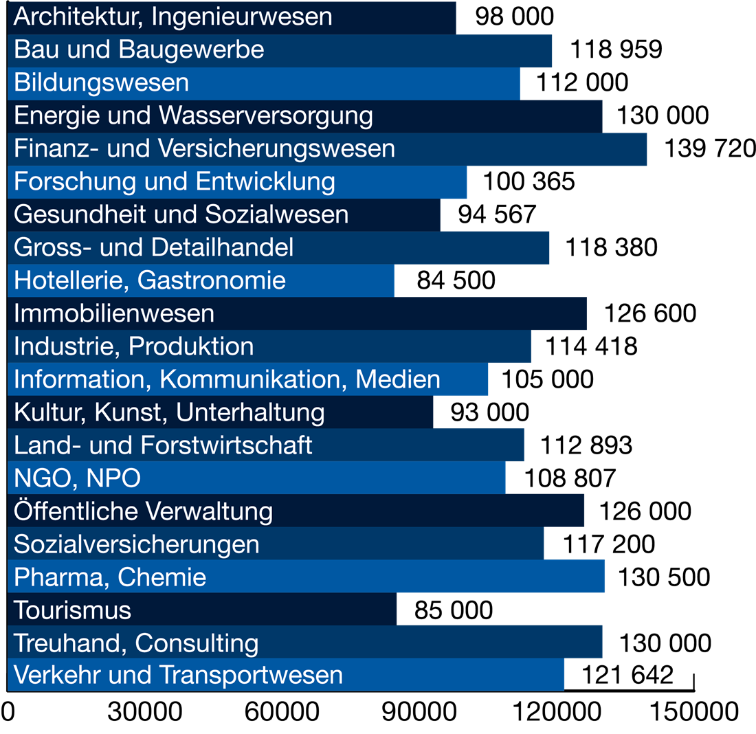 Die Zusammensetzung der Umfrageteilnehmenden hat jeweils einen Einfluss auf die vorliegenden Lohndaten. Der Medianlohn* aller Teilnehmenden liegt 2025 bei 112’851 Franken jährlich. Wie in anderen Jahren zeigt sich die Finanz- und Versicherungsbranche als die zahlungskräftigste. Zudem haben die Branchen Gesundheit und Soziales aufgeholt. Der Männeranteil allerdings bleibt hier mit 26 Prozent tief.