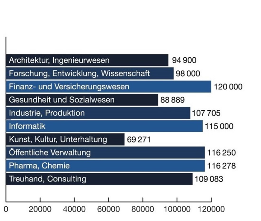 Die gute Nachricht: Der Medianlohn ist seit der letzten Erhebung 2021 um gut vier Prozent von knapp 100 000 auf 104 000 Franken angestiegen. FH-Absolvent:innen verzeichnen durch praktisch alle Branchen hindurch einen Lohnsprung, der vor allem auf die Lohnrunde 2023 zurückgeht und damit die allgemeine Entwicklung bestätigt, dass zumindest die Teuerung bei den Salären ausgeglichen wurde. Den grössten Zuwachs verzeichneten mittlere Kader mit einem Plus von 7,1 Prozent seit 2021. Spitzenreiter ist wiederum das Finanzund Versicherungswesen mit einem Medianlohn von 120 000 Franken (siehe Grafik rechts oben). Mit 115 000 Franken liegen auch die Informatiker unter den Topverdienern. Gerade für Berufseinsteiger beziehungsweise «Frisch-Absolvent:innen» lohnt sich die vom Fachkräftemangel geprägte Berufsgattung: Mit einem Medianlohn von 90 000 Franken liegt diese Branche bei den Befragten mit Bachelor-Abschlussjahr 2022 am höchsten.