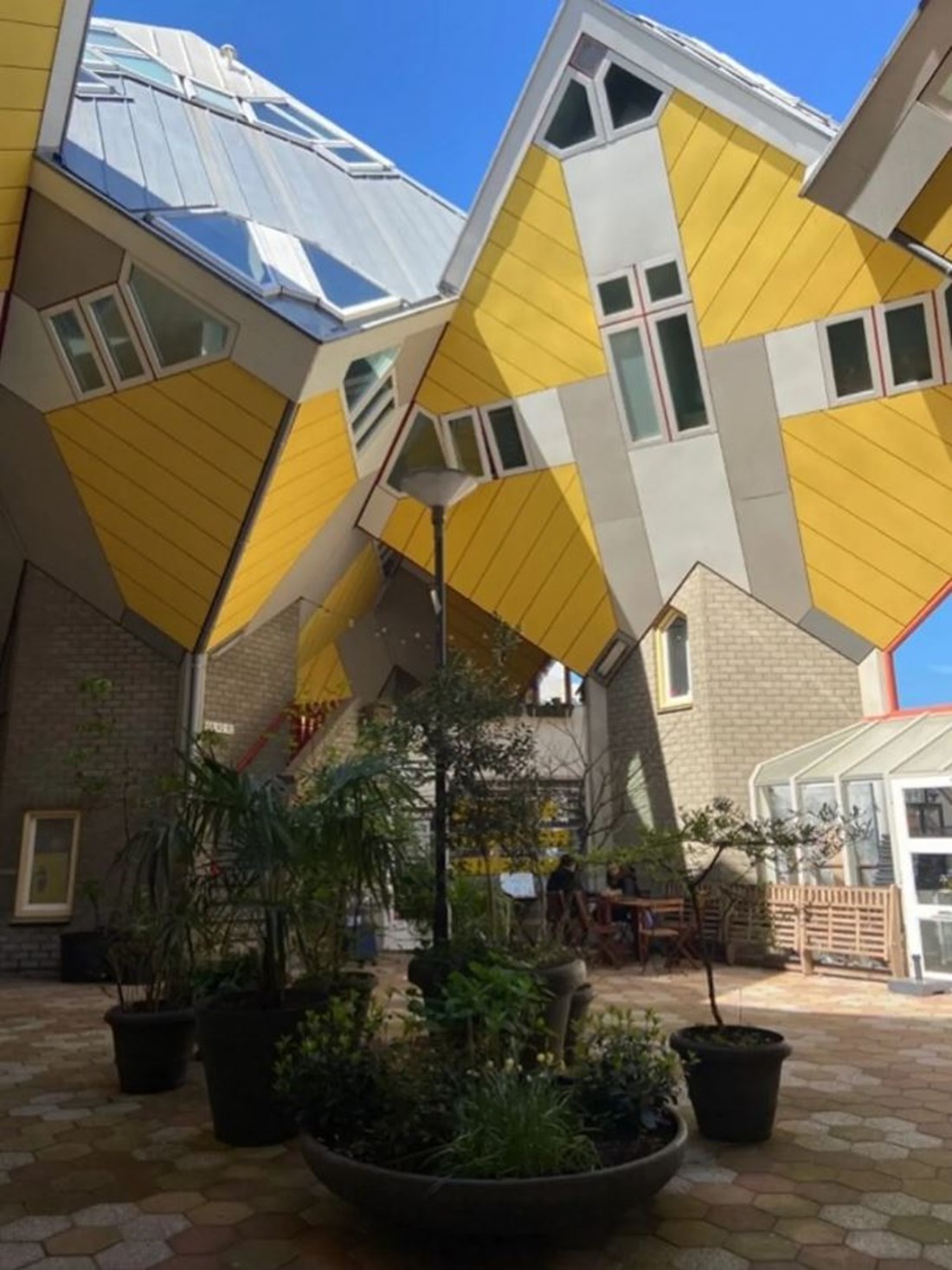Fit und munter starteten wir in den zweiten Tag unseres Rotterdam-Abenteuers. Heute trafen wir uns an einem anderen Standort. Es war spannend zu sehen, an welchen Plätzen unsere neuen Kolleginnen und Kollegen überall so Unterricht hatten. Auch am zweiten Tag gab es zuerst eine kurze Einführung in unsere Tagesaufgabe und spannende Vorträge. Danach gingen wir das erste Mal an unsere Locations. Wir hatten die Cube Houses. Von aussen sah das Ganze ziemlich interessant aus, als wir jedoch in den «Innenhof» gingen, merkten wir schnell, dass es hier vieles zu verbessern gab. Die anscheinende Touristenattraktion war doch nicht so toll, wie sie anfangs schien. Es war eher kahl und der Wind zog eiskalt durch den Hof. Da es uns dann zu kalt wurde, gingen wir in die naheliegende Bibliothek und konnten dort noch einige Sketch-Übungen durchführen, sowie an weiteren Workshops teilnehmen. Den Abend liessen wir gemütlich am Hafen ausklingen.
