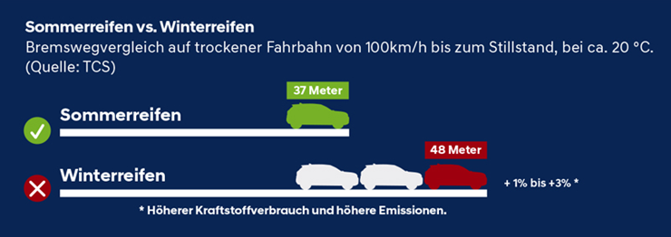 Wer rechtzeitig wechselt, verhindert unnötigen Verschleiss. Winterreifen, die im Sommer gefahren werden, verlieren schneller an Profil und müssen früher ersetzt werden.