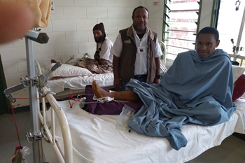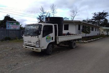 Das Spital hat keine reguläre Wasserversorgung. Jeden Tag fährt ein Pickup Truck vier Kilometer ins Tal zum Chimbu River, um dort Wasser in einen 10'000 Liter Tank zu pumpen. Dann geht es zurück zum Spital, denn das Flusswasser ist die Wasserversorgung für das Spital – ein unhaltbarer Zustand.